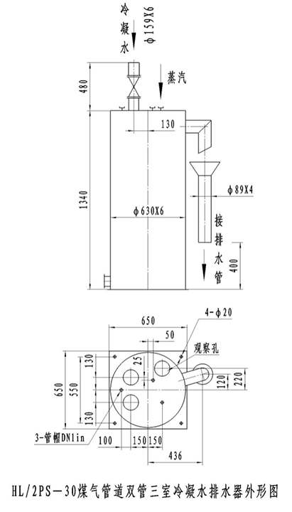 3、插入敝開室的DNl″蒸汽管,視南北地區(qū)的氣候條件決定是否需要接上外部蒸汽管,南方地區(qū)不接蒸汽管時需用管帽蓋上。