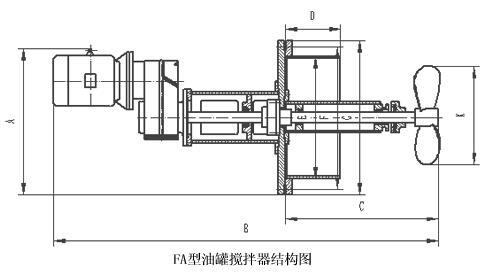 側(cè)向伸入式攪拌機(jī)是由儲(chǔ)罐的側(cè)壁伸入罐內(nèi),它通過(guò)法蘭蓋與罐體的開口法蘭相聯(lián)結(jié)。攪拌機(jī)的槳葉為船用螺旋槳型。由于螺旋槳的轉(zhuǎn)動(dòng),使罐內(nèi)液體產(chǎn)生兩個(gè)方向的運(yùn)動(dòng),一個(gè)沿著螺旋槳軸線方向向前運(yùn)動(dòng),另一個(gè)沿螺旋槳圓周方向的運(yùn)動(dòng)。軸線方向的運(yùn)動(dòng),由于受到罐壁的阻礙而使罐內(nèi)液體沿著罐壁作圓周方向的運(yùn)動(dòng),而液體沿螺旋槳圓周方向的運(yùn)動(dòng),就使罐內(nèi)液體上下翻動(dòng),這樣就使罐內(nèi)液體得到攪拌,并可防止罐內(nèi)沉積物的堆積。